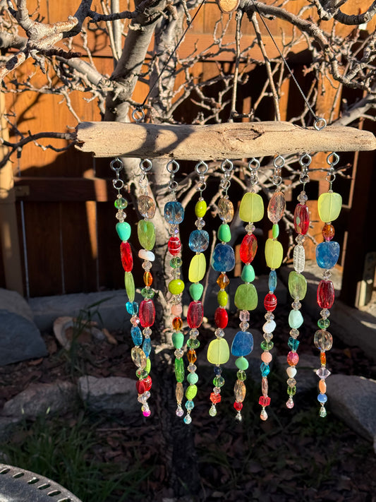 Handcrafted Colorful Beaded Suncatcher with Driftwood | Rainbow Glass & Acrylic Beads | Window or Garden Decor