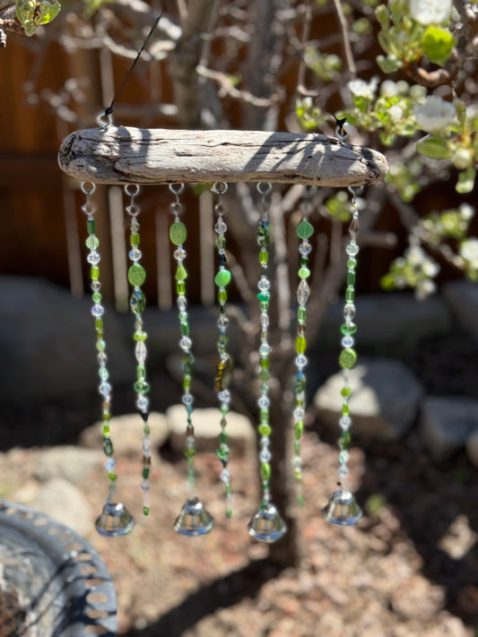 Handcrafted Green Glass Beaded Sun Catcher with Driftwood & Bells