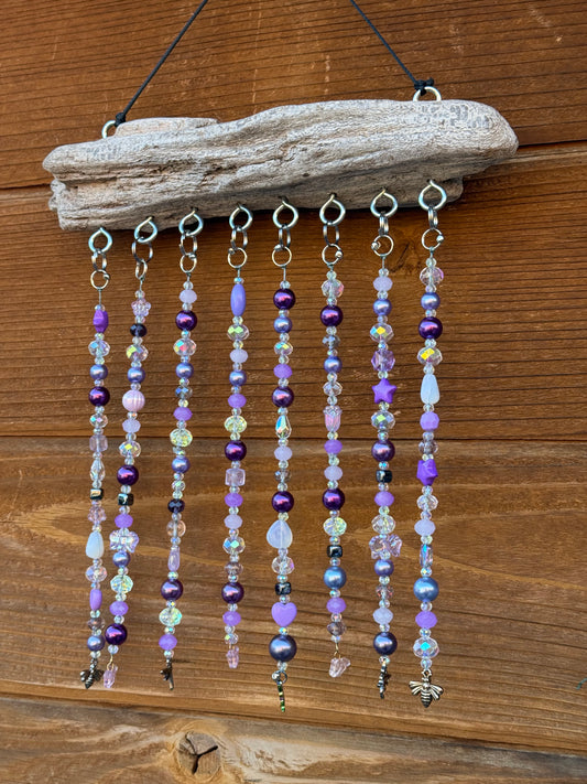 Purple Beaded Suncatcher with Driftwood | Boho Window Decor | Glass & Acrylic Beads | Handmade Hanging Suncatcher