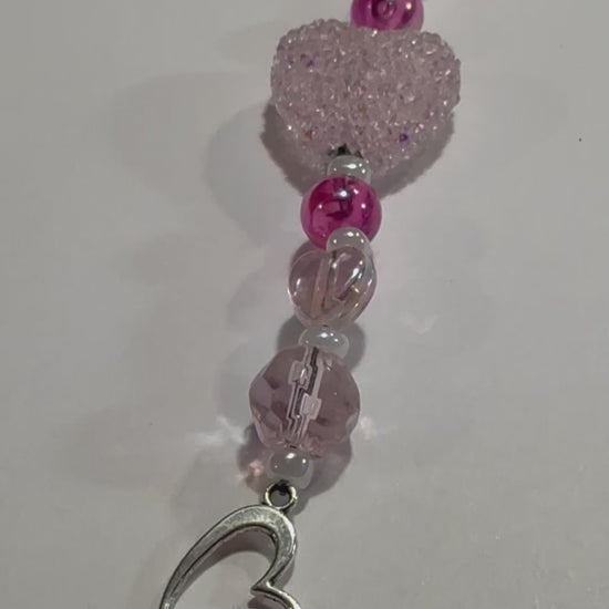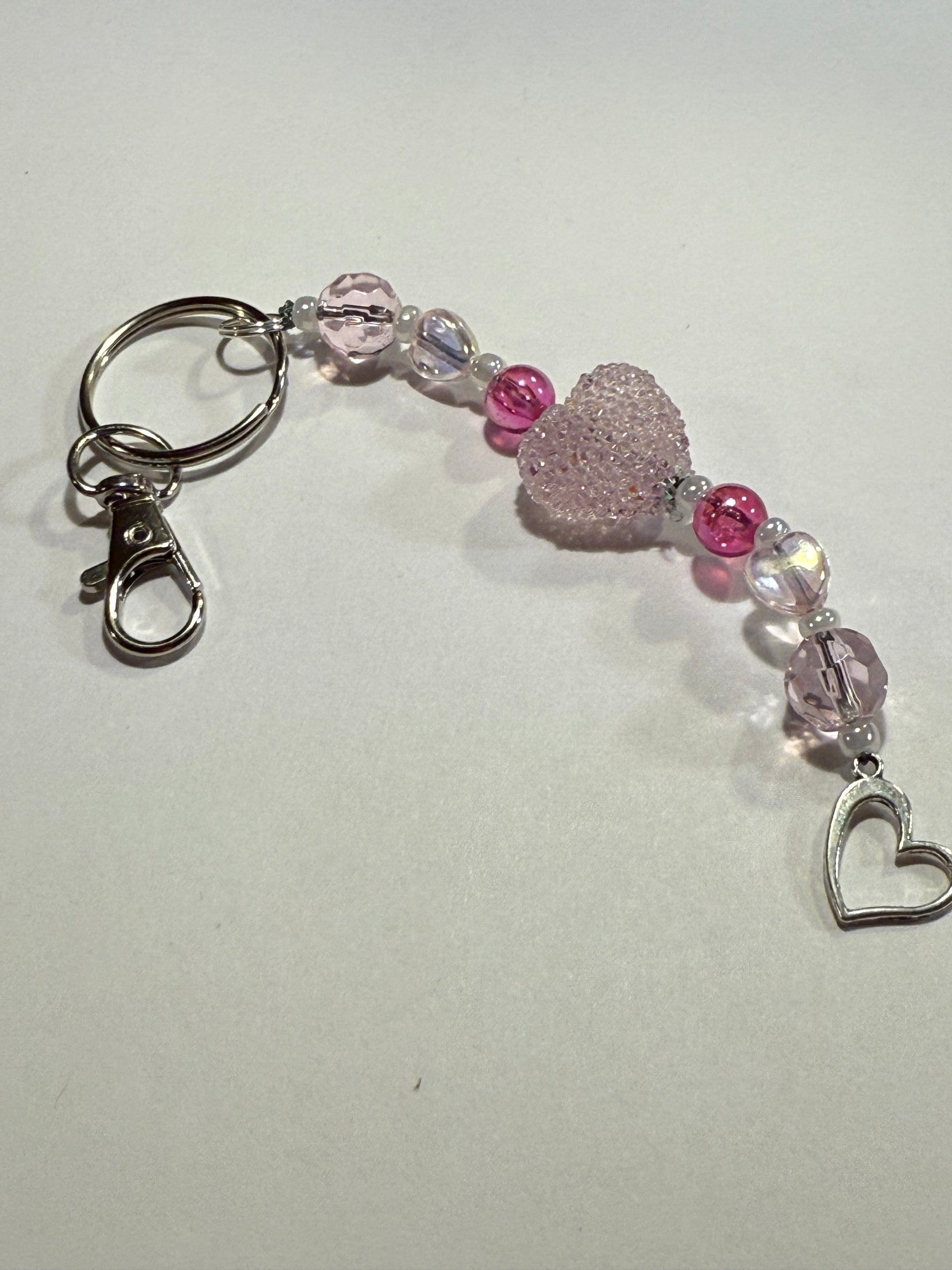 Delicate and timeless, this handmade blush pink heart keychain is a romantic accessory designed to add a gentle touch of sparkle wherever it’s worn. Featuring faceted blush and crystal-clear beads with a shimmering textured heart centerpiece and a graceful silver heart charm, this piece is soft, feminine, and full of charm.