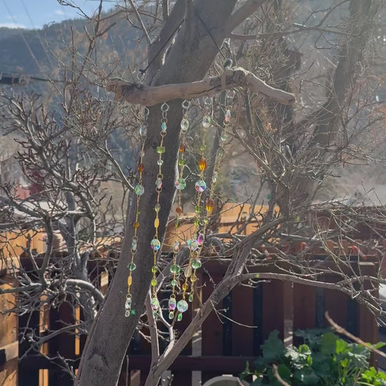 This handcrafted driftwood sun catcher features cascading strands of shimmering green, brown, and clear glass beads, carefully arranged to catch and reflect the light. Subtle earth tones and faceted glass create soft sparkle and movement, making this piece perfect for a window, patio, sunroom, or garden space.