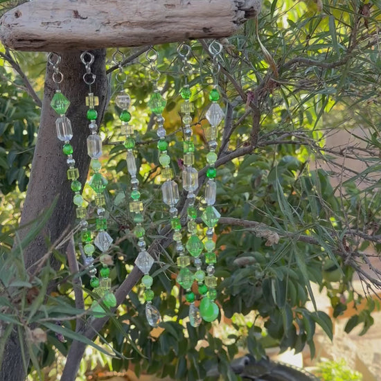 Bring sparkle, color, and charm to your home or garden with this handcrafted beaded suncatcher. Made with a variety of green and clear beads and whimsical charms, each strand reflects the sunlight beautifully, creating a dazzling display of light and color.