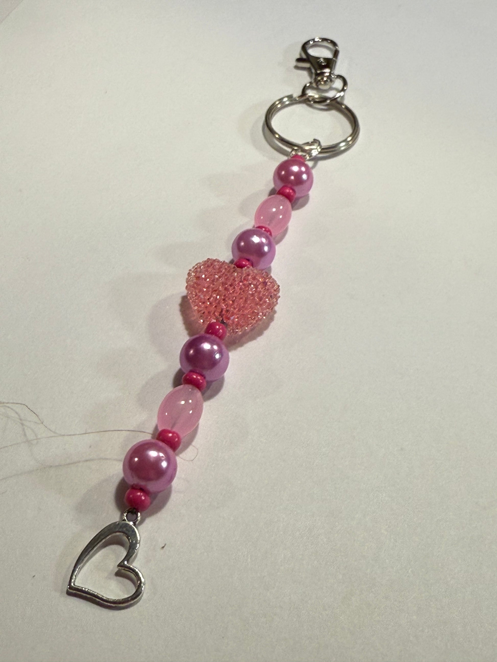 Sweet, feminine, and full of charm, this handmade pink heart beaded keychain is a beautiful way to celebrate love. Featuring soft pink and blush beads with a sparkling textured heart centerpiece and a delicate silver-tone heart charm, this piece adds a romantic touch to keys, purses, or handbags.